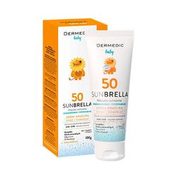 Солнцезащитное молочко для детей Dermedic Sunbrella Baby рекомендуется для чувствительной кожи лица и тела детей и младенцев с 6 месяцев в качестве защиты от UVA и UVB лучей во время пребывания на солнце.