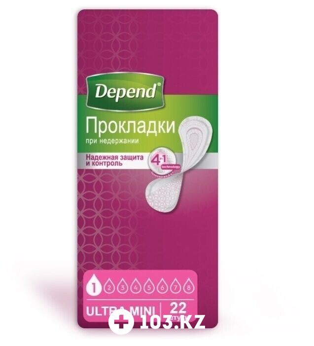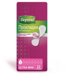 Прокладки Depend Ultra Mini для женщин, 22 шт. Новые прокладки Depend Ultra Mini созданы специально для защиты при капельной и легкой степени недержания. Технология 4 в 1. Надежная защита и контроль. Преимущества: • Полный контроль над протеканием. Специальная форма с боковыми бортиками Leak-Block (Лик-Блок) для максимальной защиты от протекания. • Максимальная сухость. Обеспечивает сухость в 3 раза дольше, чем обычная прокладка. • Быстрое впитывание. Быстро впитывающий слой для максимальной защиты и комфорта . • Контроль над запахом. ABSORB-LOC (Абсорб-Лок) быстро впитывает влагу и удерживает запах.