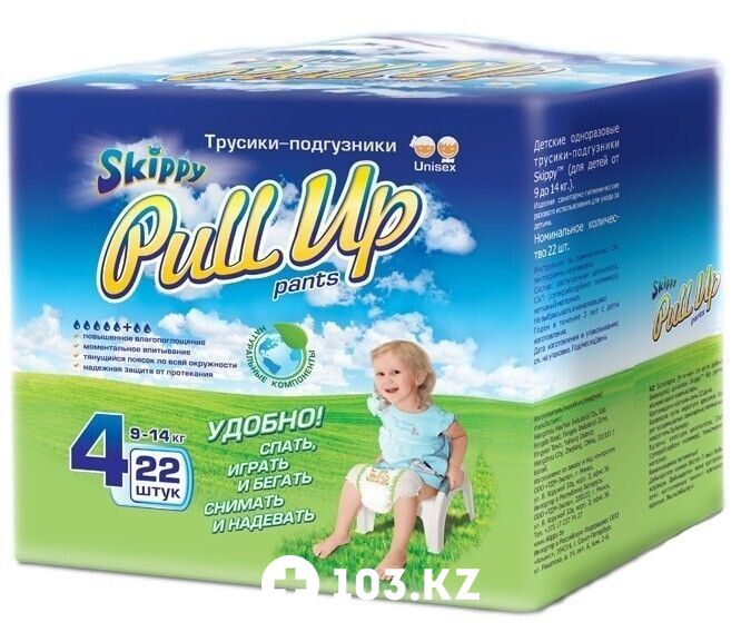 Реализация товара Подгузники-трусики 4 (9-14кг) Pull Up (22шт) Skippy в Алматы осуществляется только в стационарном торговом объекте по указанному адресу продавца. Информация о товарах и услугах на портале 103.kz носит справочный характер и не является публичной офертой.