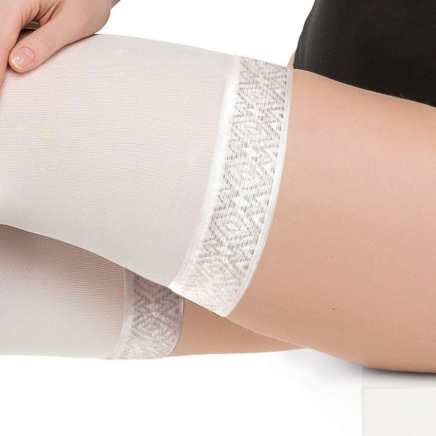 Широкая силиконовая лента (5 см) обеспечивает удобную фиксацию изделия на бедре, надежно фиксирует чулок, не препятствуя нормальному кровотоку, исключает сползание или скручивание чулок при ношении.