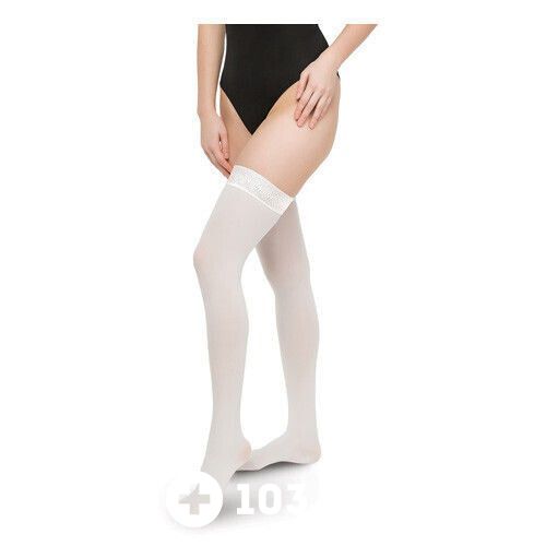 Широкая силиконовая лента (5 см) обеспечивает удобную фиксацию изделия на бедре, надежно фиксирует чулок, не препятствуя нормальному кровотоку, исключает сползание или скручивание чулок при ношении.