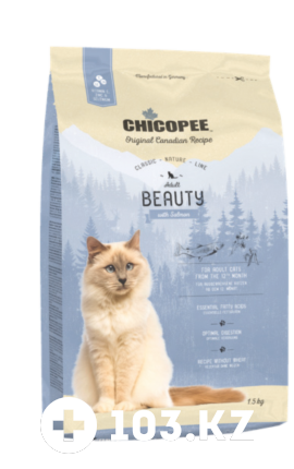 Chicopee CNL BEAUTY с лососем - полноценное питание для взрослых кошек, способствующее улучшению пищеварения, здоровью и долголетию животного.