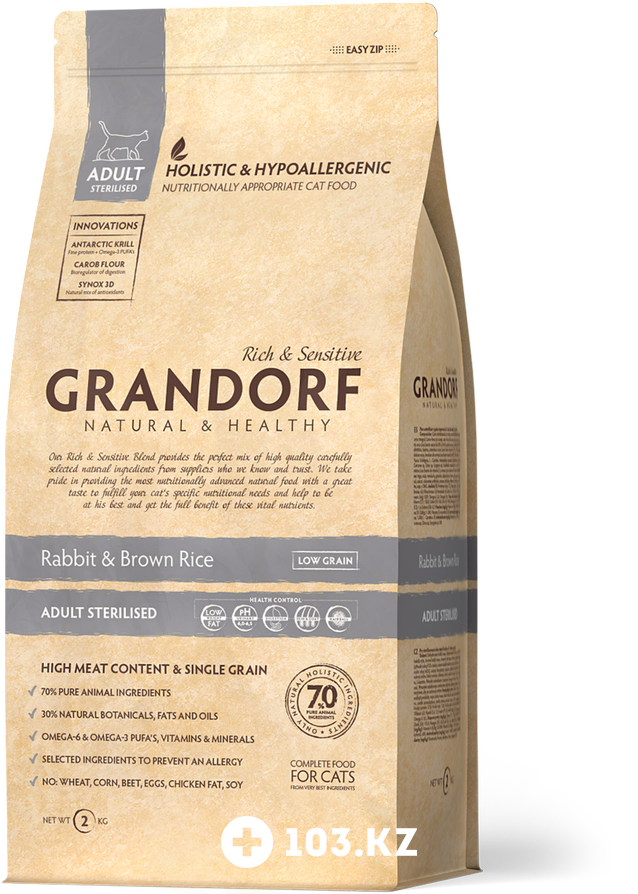 Указанная цена на Кролик с рисом для стерилизованных кошек Grandorf в Алматы может отличаться от фактической. Если в описании или цене вы заметили неточность или ошибку, пожалуйста, сообщите нам на почту help@103.kz.
