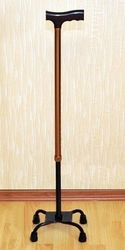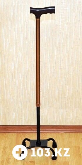 Телескопическая металлическая трость. Обладает повышенной устойчивостью. Большая площадь опоры с четырьмя ножками помогает человеку с нарушениями координации движения ходить и стоять, опираясь на нее. Возможна регулировка под правую либо под левую руку.