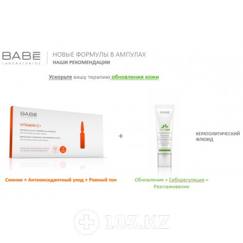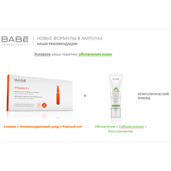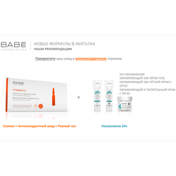 Содержит: • Стабильный витамин C 10% • Лакрица 5% • Естественный увлажняющий фактор 5% Как можно использовать ампулы Babe VITAMIN C+ с другими продуктами Babe: + Превратите ваш уход в антиоксидантную терапию: VITAMIN C+ (Сияние+Антиоксидантный уход+Ровный тон) + 24Ч УВЛАЖНЕНИЯ (УВЛАЖНЯЮЩИЙ 24H КРЕМ-ГЕЛЬ или УВЛАЖНЯЮЩИЙ 24H или ЛЁГКИЙ КРЕМ С SPF20 или УВЛАЖНЯЮЩИЙ И ПИТАТЕЛЬНЫЙ КРЕМ С SPF20). + Ускорьте вашу терапию обновления кожи VITAMIN C+ (Сияние+Антиоксидантный уход+Ровный тон) + КЕРАТОЛИТИЧЕСКИЙ ФЛЮИД (Обновление+Себорегуляция+Разглаживание).
