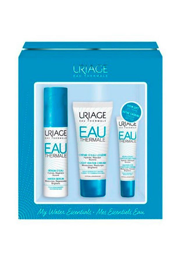 Лёгкий увлажняющий крем для лица URIAGE EAU THERMALE CREME D'EAU LEGERE 40 мл позаботится о смешанной и нормальной коже, легкая текстура быстро впитывается. Сыворотка увлажняющая для обезвоженной кожи лица URIAGE EAU THERMALE SERUM D'EAU 30 мл окажет мгновенный освежающий и восстанавливающий эффект, Увлажняющий крем для контура глаз Урьяж URIAGE EAU THERMALE SOIN D'EAU CONTOUR DES YEUX 15 мл уберет следы усталости и отечность, разгладит морщинки, сделает взгляд бодрым и юным. Подарочный набор Урьяж О Термаль станет заботливым и нужным подарком!