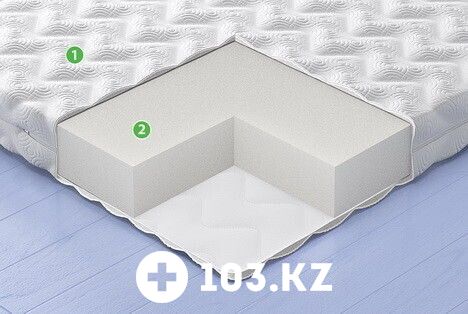 2 - Пенополиуретановый блок 10 см. Синтетический пенополиуретан обладает хорошей воздухопроницаемостью, гипоаллергенный. Придает матрасу упругость и комфорт.