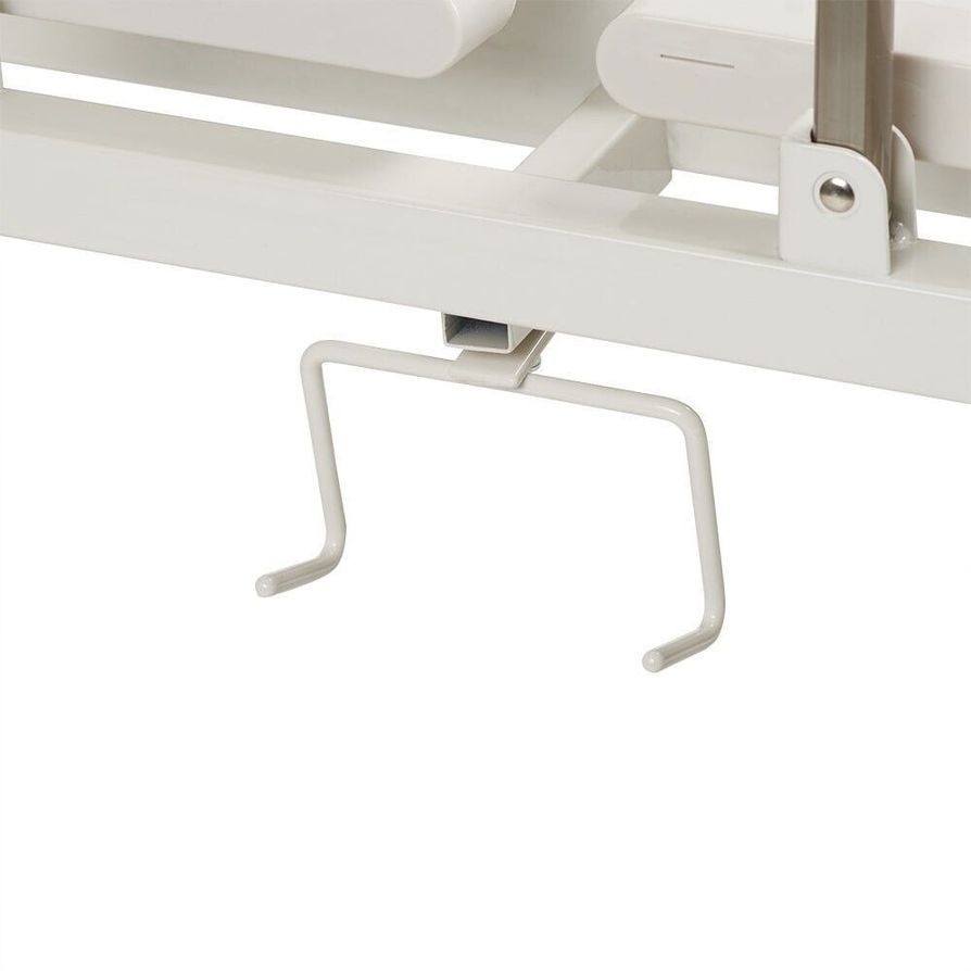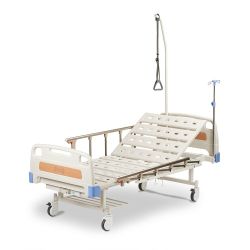 Рама кровати имеет отверстия для установки стойки-держателя для внутривенных инъекций, устройства для подтягивания и ограждений боковых (рейлингов) для кровати.