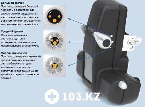 Vantage Plus имеет независимую настройку взаимного расположения оптических осей освещения и наблюдения. Это дает возможность проведения исследования в самых трудных случаях узкого зрачка, а также становятся доступными для наблюдения очень далекие периферийные области глазного дна.