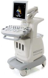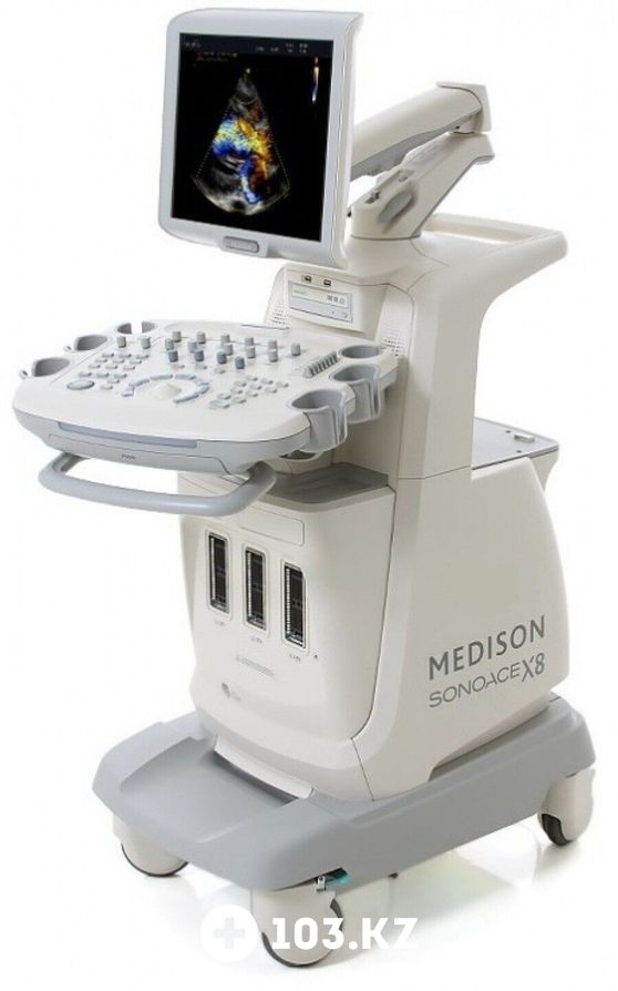 SonoAce X8 - ультразвуковой сканер компании Samsung Medison с цветным, энергетическим, направленным энергетическим, тканевым, импульсным и непрерывноволновым допплером, трехмерным УЗИ в реальном времени (3D обычными и 4D объемными датчиками). Высочайшая разрешающая способность, новые технологии формирования трехмерного изображения, мультислайсинг, современный итальянский дизайн.