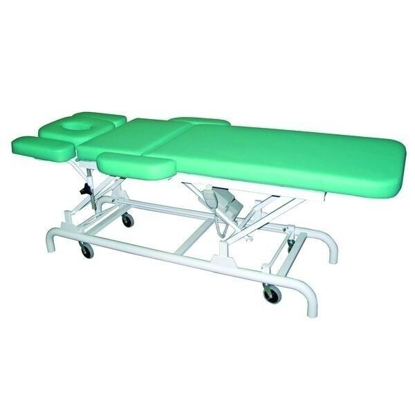 Стол состоит из металлического каркаса и трехсекционного лежака. Основа лежака – ДСП, но для комфорта пациентов сверху кладется поролон и обтягивается кожзаменителем. Заказчик может подобрать цвет кожи в соответствии с концепцией оформления кабинета.
