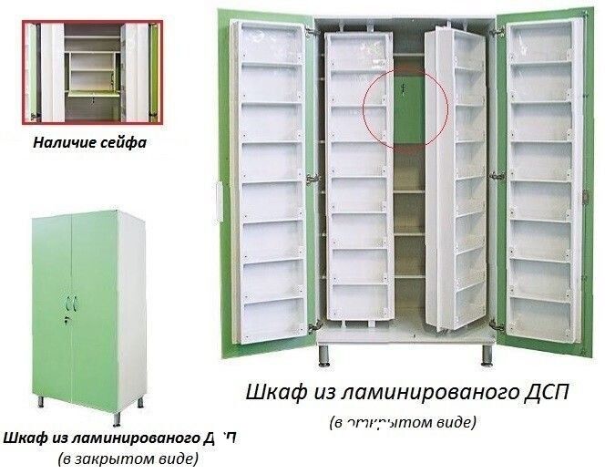 Дверцы внешней части способны раскрываться на 180°. Особенностью является встроенный сейф для хранения сильнодействующих и психотропных препаратов, закрывающийся на отдельный стальной замок.