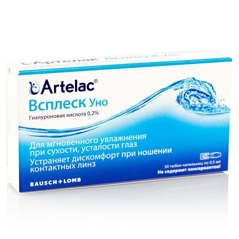 Артелак Всплеск Уно – это высококачественные увлажняющие капли для глаз. В состав этого средства входит натуральный полимер гиалоурановая кислота. Купить его рекомендуют людям, страдающим от сухости глаз.