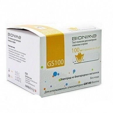 Bionime – один из ведущих мировых лидеров по производству товаров для диабетиков, выпустившая несколько моделей глюкометров, каждая из которых была отмечена различными наградами на престижных международных конкурсах. Для каждой модели глюкометра Bionime создаются индивидуальные тест - полоски. GS 100 – тест-полоски, предназначенные для использования только с глюкометром Bionime GM100, и только с ним Вы получите максимально точный результат измерения.