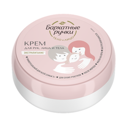 Бархатные ручки представляют универсальный крем для рук, лица и тела для всей семьи от 3-х лет. Преимущество формулы крема, в том что основу составляет ламеллярная эмульсия - инновационная текстура, схожая по строению с липидами эпидермиса, и имеющая высокое сродство с кожей человека, благодаря чему обеспечивает эффективное восстановление липидного барьера, а так же служит более эффективной системой доставки активных компонентов вглубь эпидермиса.