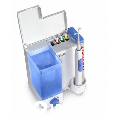 Ирригатор Aquajet LD A8 рассчитан для эксплуатации всей семьей. Давление струи воды регулируется от 300 кПа до 810 кПа посредством переключателя. В комплекте поставляется пять насадок, отличающихся цветом, поэтому перепутать их не удастся. Объем резервуара оптимален, составляет 500 миллилитров.