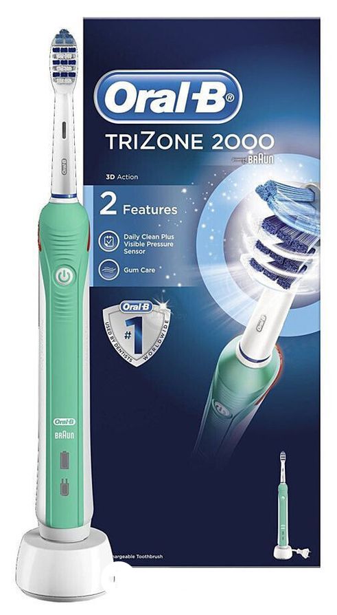 Водонепроницаемая электрическая зубная щётка Oral-B Trizone 2000 D20.513.2 с двумя режимами работы «Ежедневная чистка» и «Уход за дёснами», со встроенным аккумулятором и датчиком давления комплектуется насадкой средней жесткости TriZone. Конфигурация насадки позволяет проникать в самые труднодоступные участки между зубами, совершая при этом привычные движения обычной зубной щетки. Насадка имеет 3 зоны щетинок, для достижения лучшего комплексного результата чистки. Уникальные щетинки насадки Indicator меняют цвет, сигнализируя о необходимости замены.